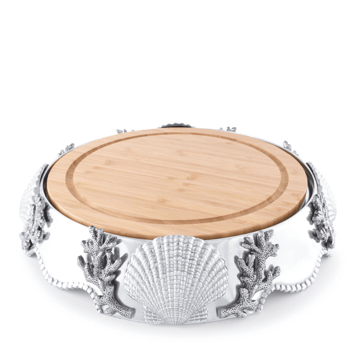 Amazingly detailed scallop shells and coral branches stand out against a highly polished signature aluminum alloy background, ringing the stand. The sea shell and coral embellishments are textural and lightly antiqued to bring out the delicate detailing. A round, 13-inch diameter, chatoyant Acacia board fits well into the ring and removes for easy cleaning.