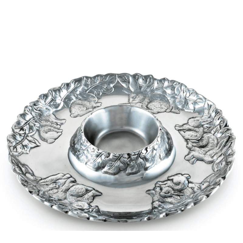 Serve in style with this enchanting handcrafted Chip & Dip Dish, made from lightweight, high-quality aluminum. Featuring delicately sculpted bunnies nestled among intricate floral detailing, this piece brings a whimsical charm to your table. Perfect for spring gatherings, Easter celebrations, or year-round entertaining, the spacious platter holds chips, crackers, or veggies, while the built-in dip bowl keeps your favorite dips conveniently in place. Durable, easy to clean, and beautifully designed, this platter is a must-have for any host or hostess who loves a touch of nature-inspired elegance.