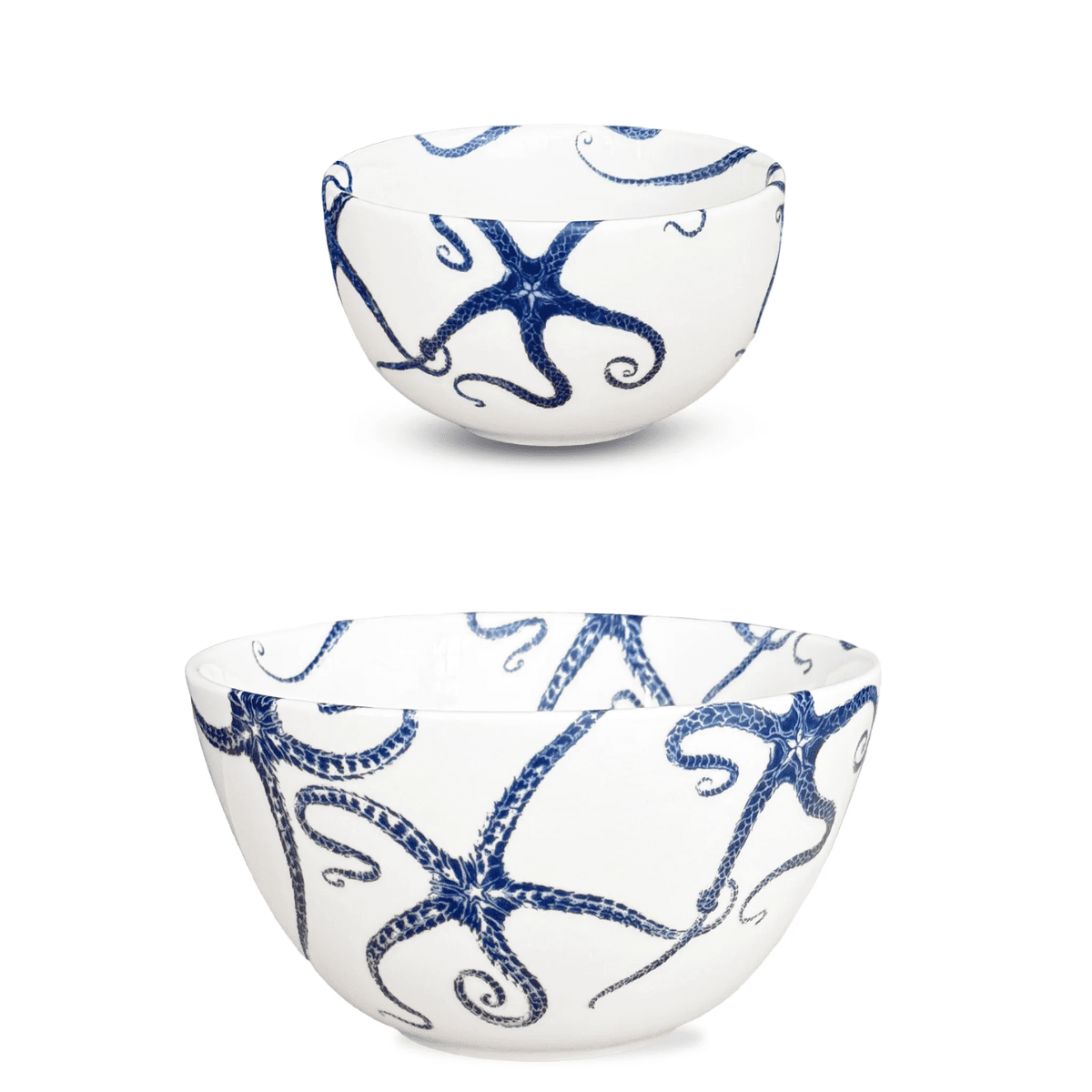 Perfect for serving appetizers, desserts, or side dishes, this elegant duo also makes an unforgettable hostess or holiday gift. Each piece is crafted from lead-free, high-fired porcelain and decorated in rich cobalt blue on creamy white, capturing the movement and beauty of ocean life in timeless coastal style.