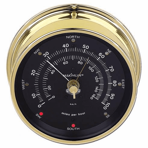 Maximum's Most Popular Wind Speed & Direction Instrument displays wind speed and gust up to 100 MPH (also 160 km/h). The outer scale measures wind speed from 0-100 MPH while the inner scale shows the 0-160 km/h equivalent.