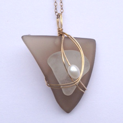 These beautiful Sea Glass Penants are handcrafted in the USA. Two pieces of sea glass, in wonderful colors are wrapped in sterling silver or 14K gold filled wire with a freshwater pearl and comes on an 18" sterling silver or gold filled chain.